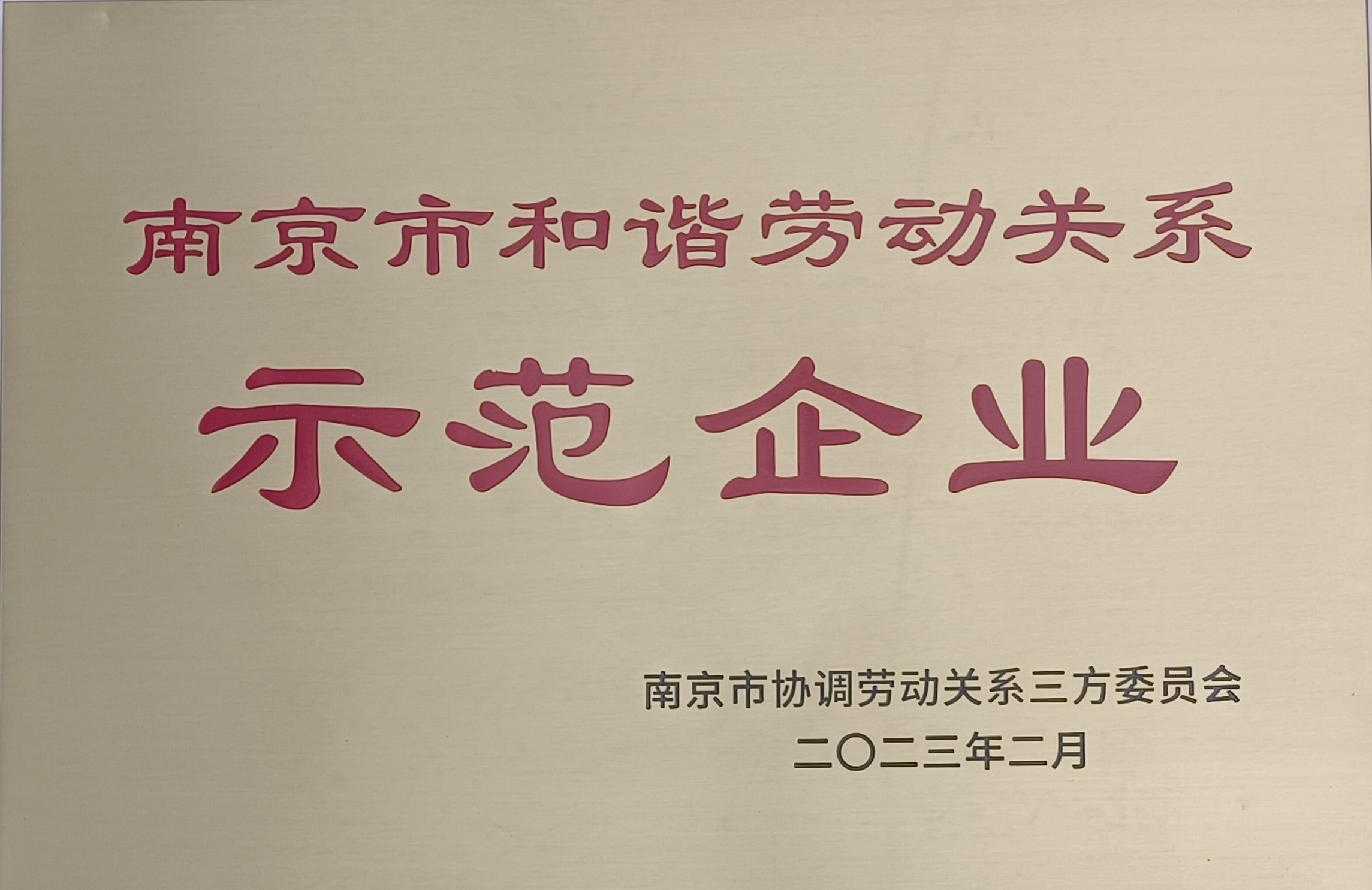 南京市和諧勞動關(guān)系示范企業(yè)證書